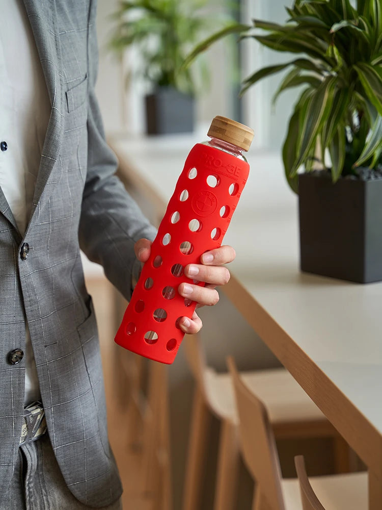 Für das BMW Motorenwerk produzierten wir Trinkflaschen aus Glas, die mit speziell entwickelten Schutzhüllen aus hochwertigem Silikon versehen wurden. Diese Hüllen trugen exklusives BMW-Branding sowie das Logo des Arbeiterbetriebsrates und waren bewusst frei von spottle-Branding, um die Corporate Identity von BMW vollständig in den Vordergrund zu stellen. Die passgenauen Schutzhüllen und die herausragende Qualität der Flaschen erfüllten die strengen Anforderungen, die BMW an alle seine Produkte und Partner stellt.