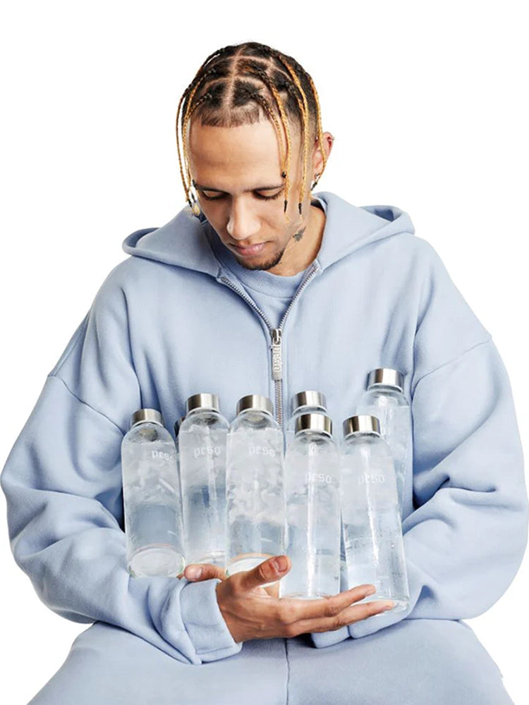 Peso, gegründet von Justin Fuchs, ist eine der aufstrebendsten Marken für Streetwear und moderne Bekleidung weltweit, bekannt für ihre exklusiven Kollektionen und hochwertigen Produkte. Im Rahmen ihrer Kollektionen RAWS 4 und RAWS 6 kooperierten wir mit dem Peso-Team, um Glas- und Thermosflaschen zu produzieren, die den hohen Standards des Labels entsprechen.