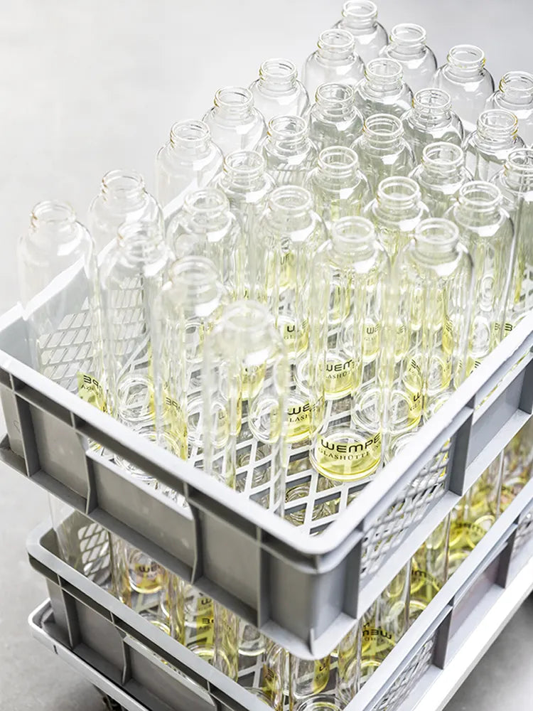 Die eleganten Glasflaschen unterstreichen das Premium-Image von WEMPE und fügen sich nahtlos in die Markenidentität des Unternehmens ein. Sie spiegeln die Exzellenz wider, die Kunden weltweit mit WEMPE verbinden.