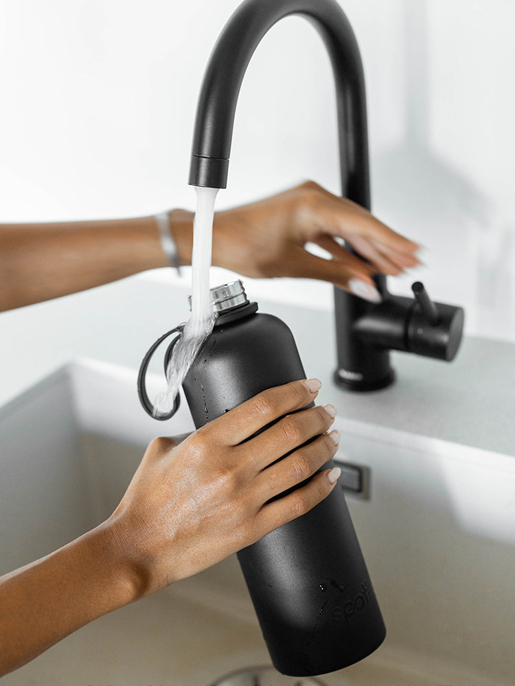 Grundsätzlich bietet die Spülmaschine eine schnelle und bequeme Grundreinigung, während die Handwäsche gezielter ist und besonders gründlich reinigt – vor allem, wenn Du die Flasche sofort wieder benutzen möchtest. Hier spielt die spottle-Silikonbürste ihre Stärken aus: Sie reinigt effektiv und schonend, ohne Kratzer zu hinterlassen, bleibt dank des abnehmbaren Bürstenkopfes hygienisch, liegt durch ihren ergonomischen, silikonummantelten Griff perfekt in der Hand und erreicht mühelos auch den Flaschenboden. Zudem ist sie in zeitlosem Schwarz und Grau erhältlich und damit nicht nur praktisch, sondern auch ein stilvolles Küchen-Accessoire.