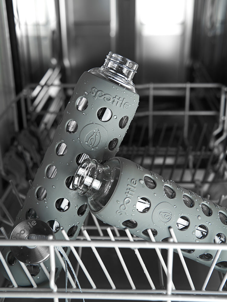 Alle spottle-Flaschen – egal ob aus Glas oder Edelstahl – sind spülmaschinengeeignet und lassen sich damit bequem reinigen. Wenn Deine Flasche eine Silikonhülle hat, kannst Du sie einfach mitsamt Hülle in die Spülmaschine stellen, ohne diese abnehmen zu müssen. Bei Flaschen mit Neoprenhülle ist das genauso unkompliziert: Die Hülle lässt sich leicht abziehen und kann, wenn nötig, separat in der Waschmaschine bei 30 °C gewaschen werden.