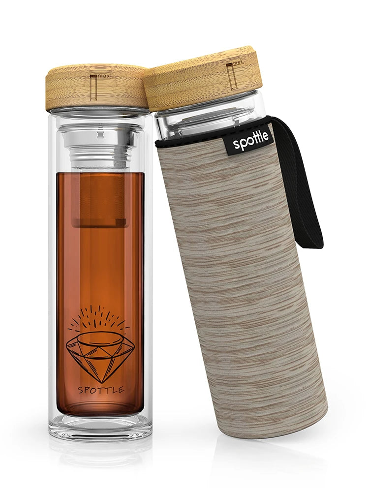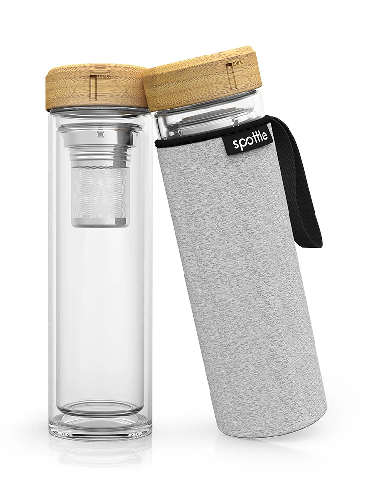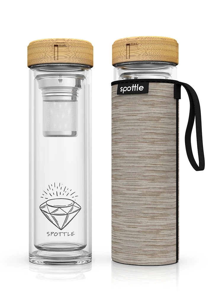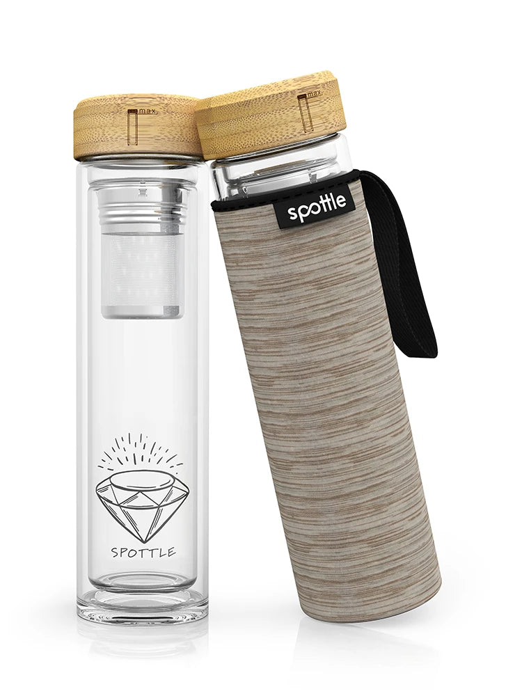 Start your eco-friendly journey with the spottle drinking bottle: a combination of durability, quality, beautiful design, and sustainability. Say goodbye to ordinary plastic bottles and welcome our sturdy, LFGB-certified glass bottle – completely free of harmful BPA and plastic additives.