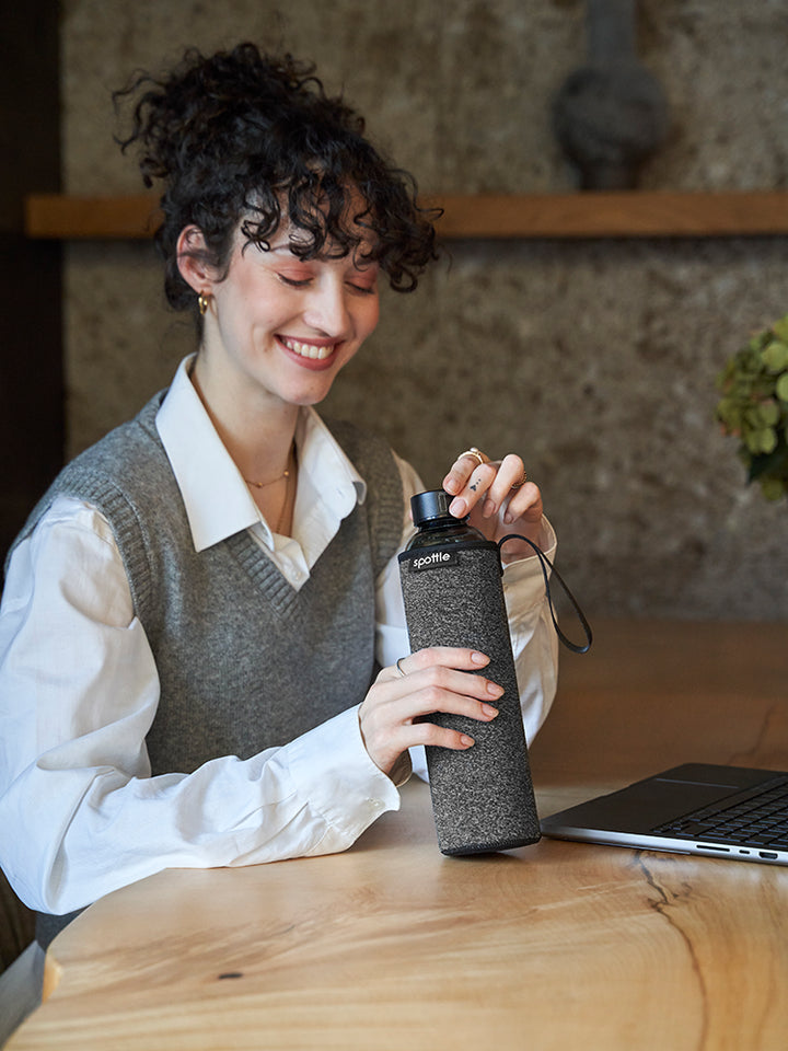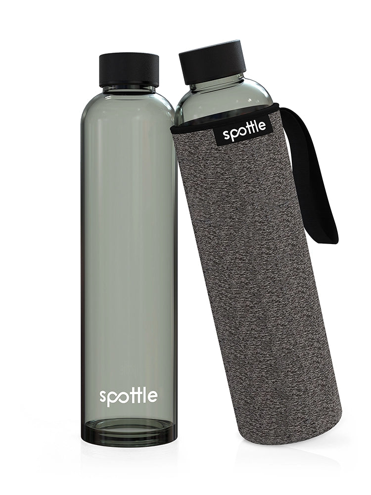 Black glass water bottle with neoprene sleeve